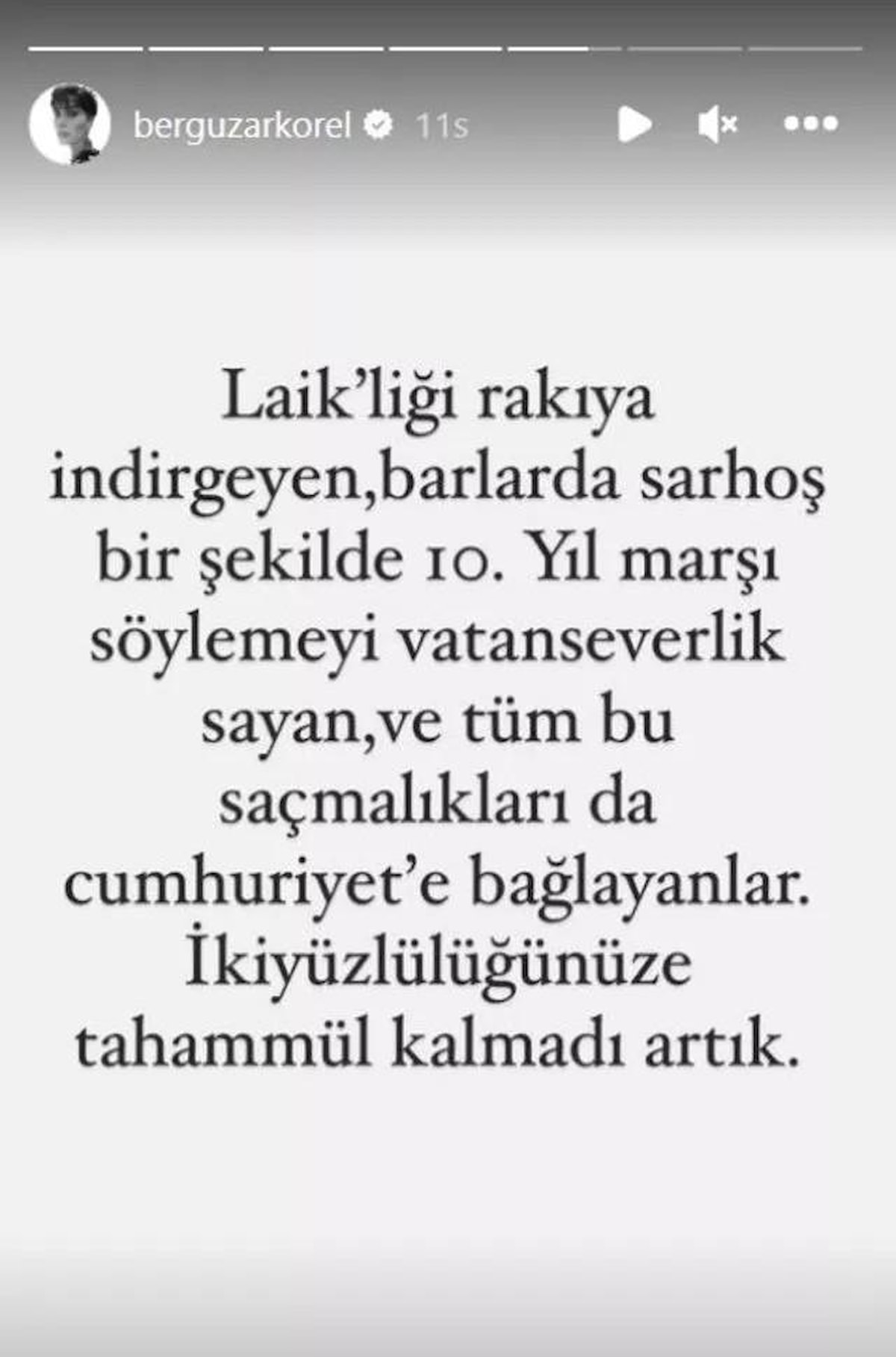 "Laikliği rakıya indirgeyen, barlarda sarhoş bir şekilde 10. Yıl Marşı söylemeyi vatanseverlik sayan ve tüm bu saçmalıkları da Cumhuriyet'e bağlayanlar... İki yüzlülüğünüze tahammül kalmadı artı