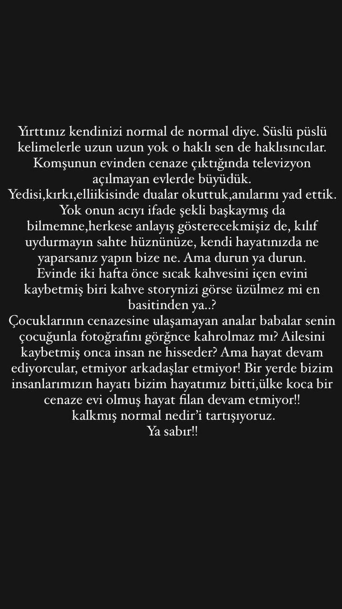"Bir yerde bizim insanlarımızın hayatı, bizim hayatımız bitti. Ülke koca bir cenaze evi olmuş, hayat devam etmiyor!"