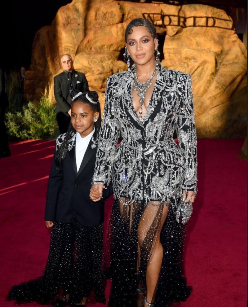 Disney filminde Kiara karakterine ses veren Blue Ivy, dalgalı saçlarıyla altın rengi bir elbise giydi.
