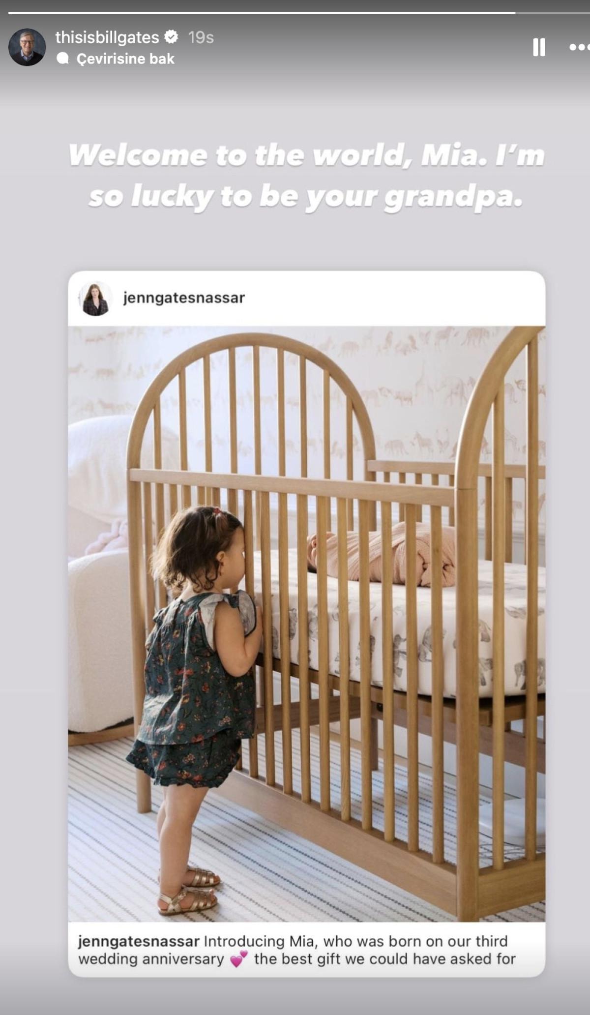 69 yaşındaki Gates, mutluluğunu "Dünyaya hoş geldin Mia. Senin büyükbaban olduğum için çok şanslıyım" sözleriyle dile getirdi.