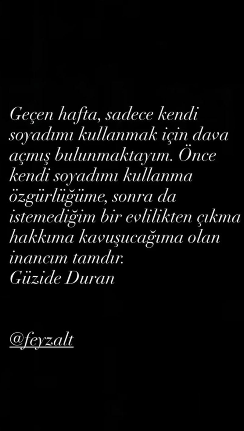 Son paylaşımlarında sadece kendi soyadını kullanmak için yeni bir dava açtığını açıklayan Güzide Duran; "Geçen hafta, sadece kendi soyadımı kullanmak için dava açmış bulunmaktayım. Önce kendi soyadımı kullanma özgürlüğüme, sonra da istemediğim bir evlilikten çıkma hakkıma kavuşacağıma olan inancım tamdır." ifadelerini kullandı.