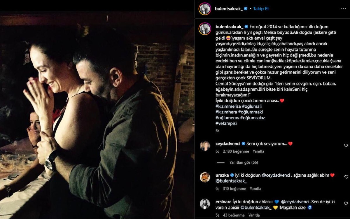 46'ncı yaşına giren eşinin doğum günü için duygusal bir yazıyla kutlayan Şakrak, Cemal Süreyya'dan alıntı yaparak "Ben senin sevgilin, eşin, baban, ağabeyin, arkadaşınım. Biri bitse biri kalır... Seni hiç bırakmayacağım." dedi.