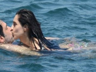 İskelede bile el ele yürüyen çift, denizde de romantizm yaşamaya devam ettiler. Çiftin bir yandan yüzüp bir yandan öpüştükleri anlar, objektiften kaçmadı.