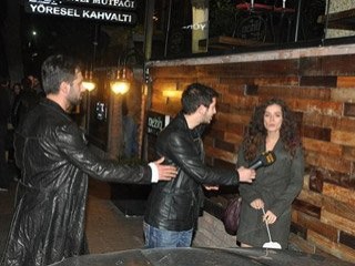 Mekan çıkışı Burak Yamantürk sevgilisi Özge Özpirinççi’ye mikrofon uzatan bir muhabirin kolundan çekerek röportaj yapmasına engel oldu. Muhabire "Arkadaşım çekil" diyen Yamantürk gergin tavırlar sergiledi. Özpirinçci ise şaşkındı.