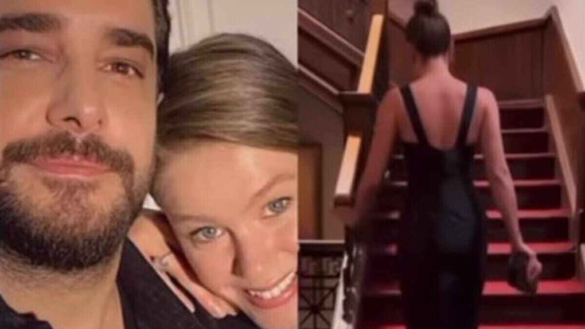 Görüntülerde, oyuncunun daracık elbisesi ile merdivenden çıkarken zorlandığı anlar yer aldı.