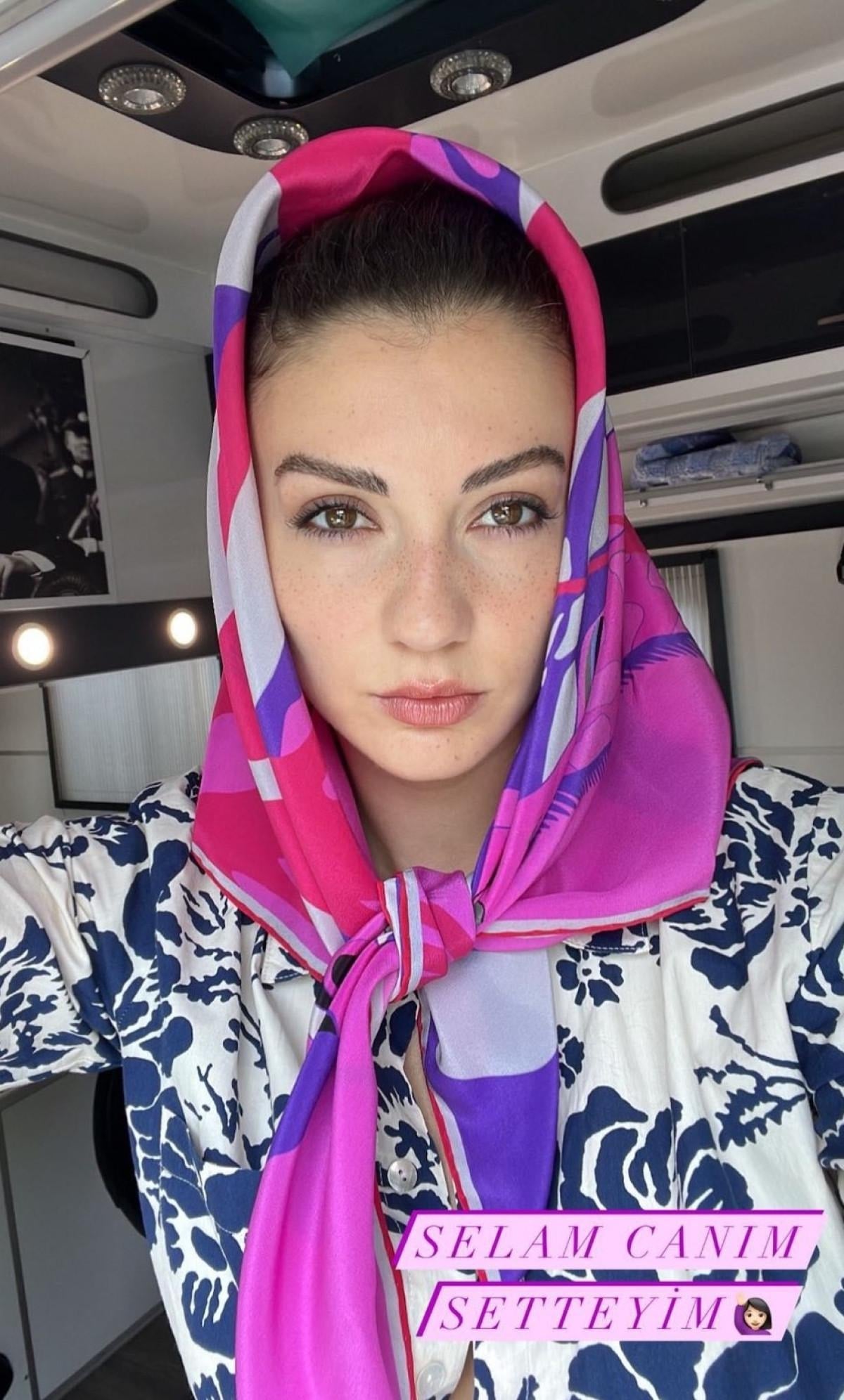 Hesabından başörtülü fotoğrafını paylaşan Özberk “Selam canım setteyim” notunu düştü.