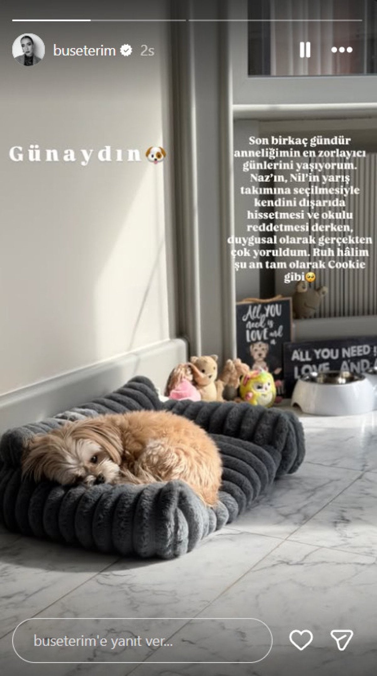 Terim, son günlerde yaşadıklarını şu sözlerle anlattı: "Son birkaç gündür anneliğimin en zorlayıcı günlerini yaşıyorum. Naz'ın, Nil'in yarış takımına seçilmesiyle kendini dışarıda hissetmesi ve okulu reddetmesi derken duygusal olarak gerçekten çok yoruldum. Ruh halim şu an tam olarak Cookie gibi."