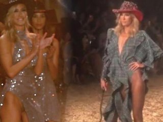 Elinde kırbaç ve kovboy şapkasıyla podyuma giriş yapan Şıkel, bütün dikkatleri üzerine çekti.