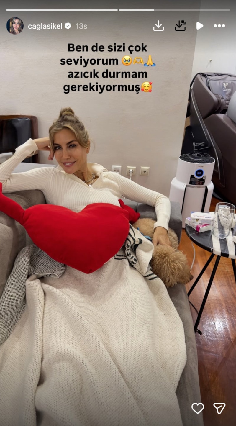 Sosyal medya hesabından bir açıklama yapan Çağla Şıkel rahatsızlığıyla ilgili bilgi vererek, "Ben de sizi çok seviyorum, azıcık durmam gerekiyormuş." ifadelerini kullandı.