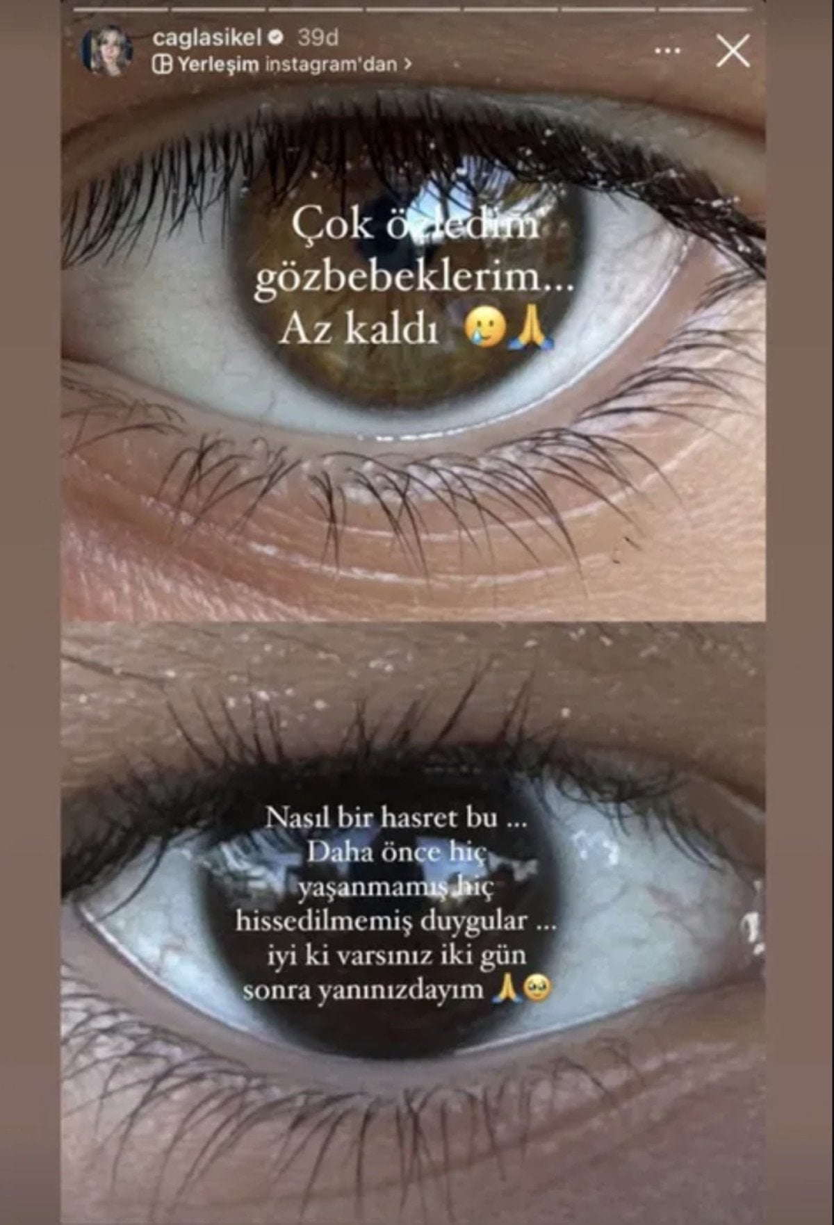 Yoğun çalışma temposu nedeniyle çocuklarından ayrı kalan Çağla Şıkel, Uzay ve Kuzey'in gözlerinin yer aldığı kareyi paylaşarak, 'Çok özledim göz bebeklerim... Az kaldı. Nasıl bir hasret bu? Daha önce hiç yaşanmamış, hiç hissedilmemiş duygular... İyi ki varsınız iki gün sonra yanınızdayım' ifadelerini kullandı.