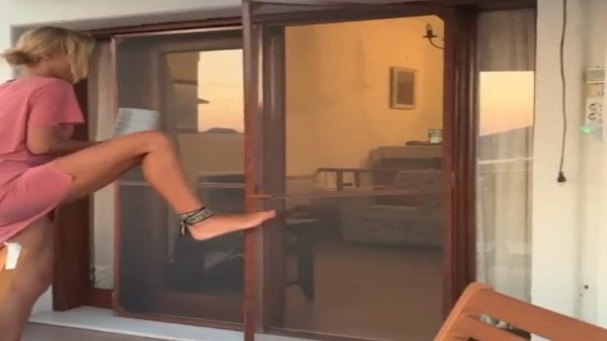 Balerinlik zamanlarından kalma becerilerini hala kullanabildiği görülen Çağla Şikel, ellerinin doluluğu sebebiyle kapıyı ayağıyla açarak içeriye giriyor.