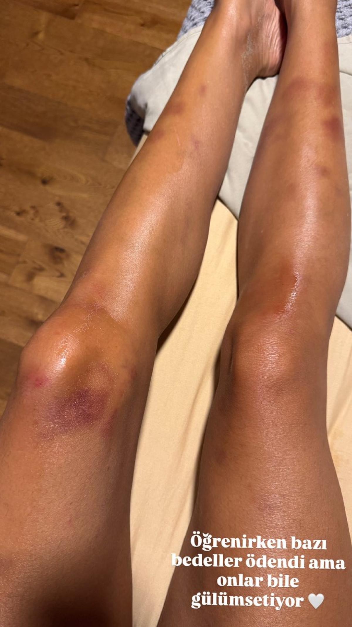 Sörfü çok sevdiğini söyleyen Şıkel, bacaklarının mosmor olduğu kareleri paylaştı.