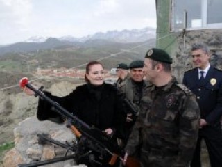 Tunceli'yi ziyaret eden Canan Erçetin, ziyaret ettiği özel harekat noktasında silahın namlusuna karanfil taktı.
