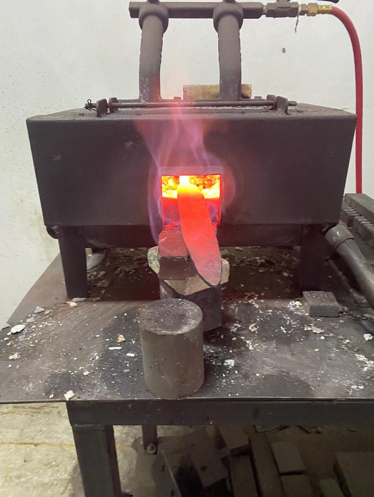 Hünal, demirci kıyafeti giymesinin ardından ateşin başına geçerek bıçak üretti.