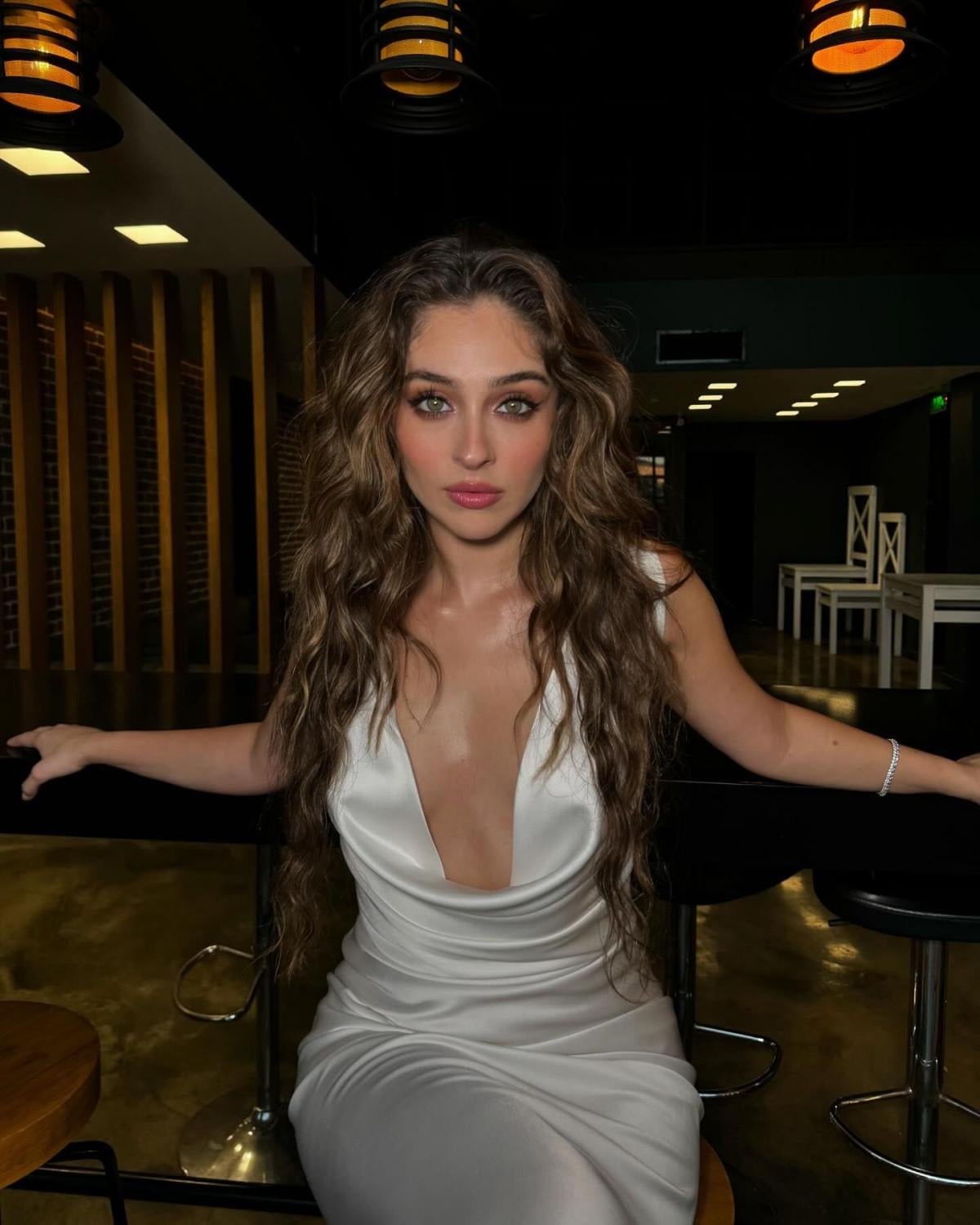 Derin göğüs dekolteli beyaz saten elbisesiyle poz veren Baysel'e beğeni yağdı. Görenler yorum yapmadan geçemedi.