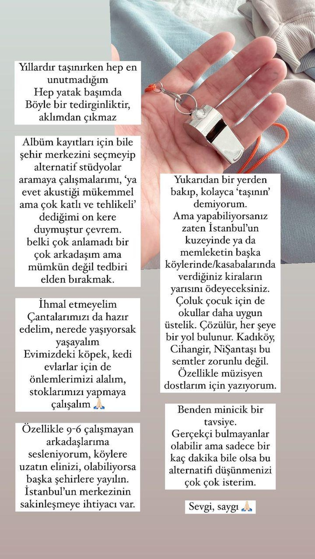 "Ceylan Ertem’in köy hayatı diye haberler çıkmıştı. Neden şehrin ortasında yaşamıyorum? En önemli sebeplerinden biri aslında 24 yıl geçmesine rağmen bu tedirginliğin geçmemesi. İstanbul’da çok acil; yapı denetimleri hızlanmalı ve önlemler artırılmalı!"