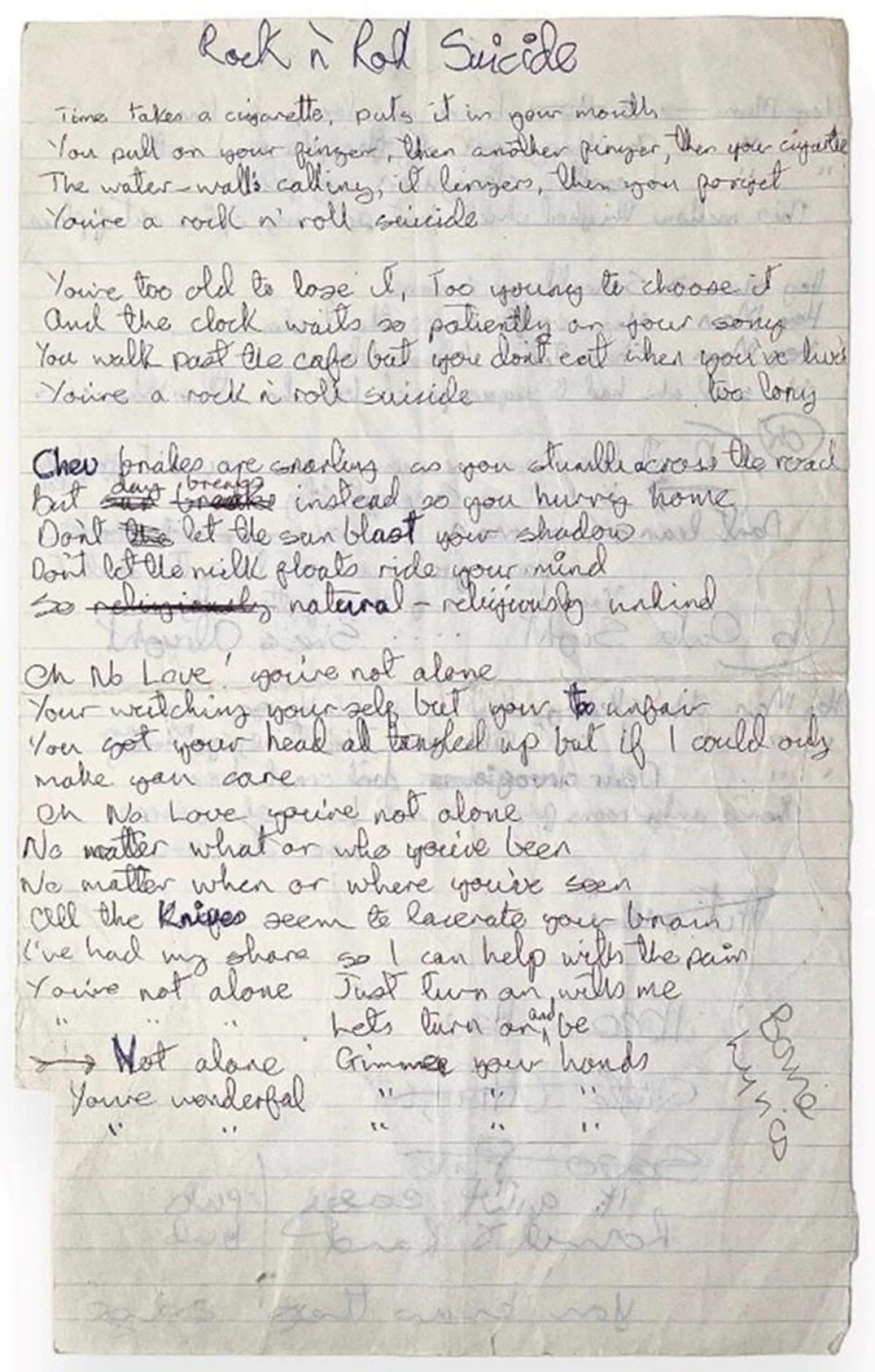 69 yaşında karaciğer kanseri nedeniyle hayatını kaybeden Bowie'nin "Rock 'n' Roll Suicide" ve "Suffragette City" adlı eserlerinin el yazısıyla yazılmış sözleri, açık artırmada satılacak.