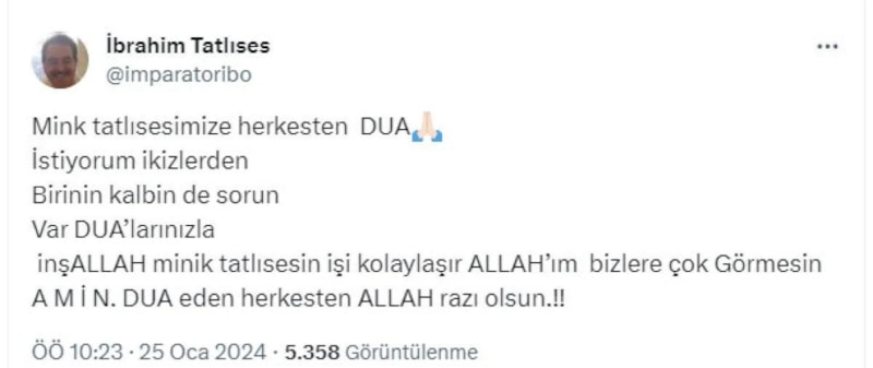 Tatlıses açıklamasında, "Minik Tatlıses'imize herkesten dua istiyorum, ikizlerden birinin kalbinde sorun var, dualarınızı inşALLAH minik Tatlıses'in işi kolaylaşır ALLAH’ım bizlere çok görmesin A M İ N. Dua eden herkesten ALLAH razı olsun.!!" dedi.
