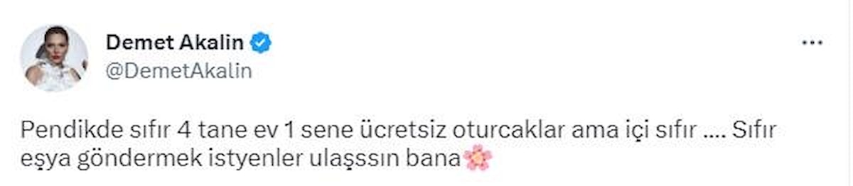 Deprem bölgelerine yardım gönderen şarkıcı Demet Akalın, depremzedeler için sosyal medya hesabında yeni bir paylaşım yaptı. Akalın, önceki gün yaptığı açıklamayla Pendik'te bulunan dört evini deprem mağdurlarına açacağını söyledi.