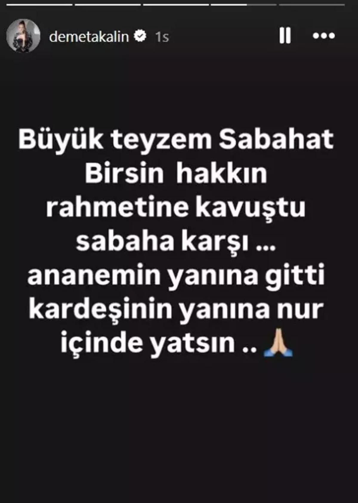 Instagram hesabından açıklama yapan Akalın, teyzesinin öldüğünü açıklayarak "Büyük teyzem Sabahat Birsin Hakk'ın rahmetine kavuştu sabaha karşı... Anneannemin yanına gitti. Kardeşinin yanında nur içinde yatsın." dedi.