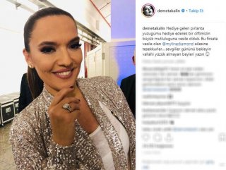 Instagram hesabından pırlanta yüzükle çekilen fotoğrafını paylaşan Demet Akalın, 'Hediye gelen pırlanta yüzüğümü hediye ederek, bir çiftimizin büyük mutluluğuna vesile olduk. Sevgililer gününü bekleyin vallahi yüzük almayan beyleri yazın' notunu düştü.