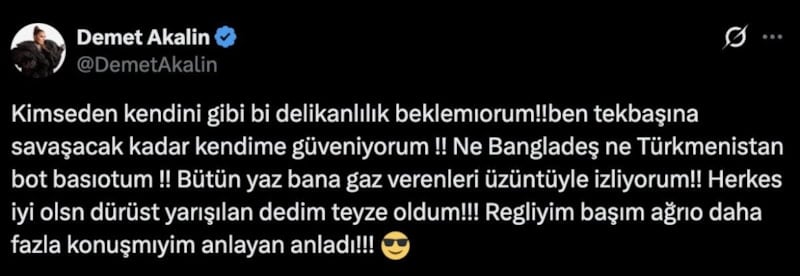 Blok3 ile yaşadığı polemikle gündeme gelen Demet Akalın, sosyal medya hesabından yeni bir paylaşım yaptı. Akalın yazısında, "Ben tek başıma savaşacak kadar kendime güveniyorum" dedi. Kullancılar, şarkıcının yazdıklarını ise okumakta zorlandı.