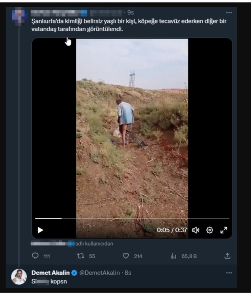 Ünlü şarkıcı Demet Akalın, Şanlıurfa'da köpeğe tecavüz ettiği ileri sürülen yaşlı adama sosyal medyadan tepki gösterdi.