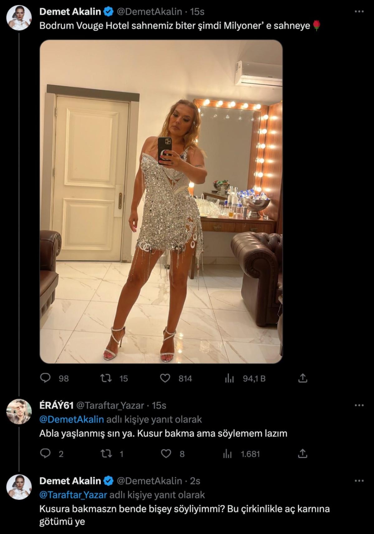 Demet Akalın kendisine yorum yazan hayranına, "Bu çirkinlikle aç karnına g***tümü ye" şeklinde cevap yazdı.