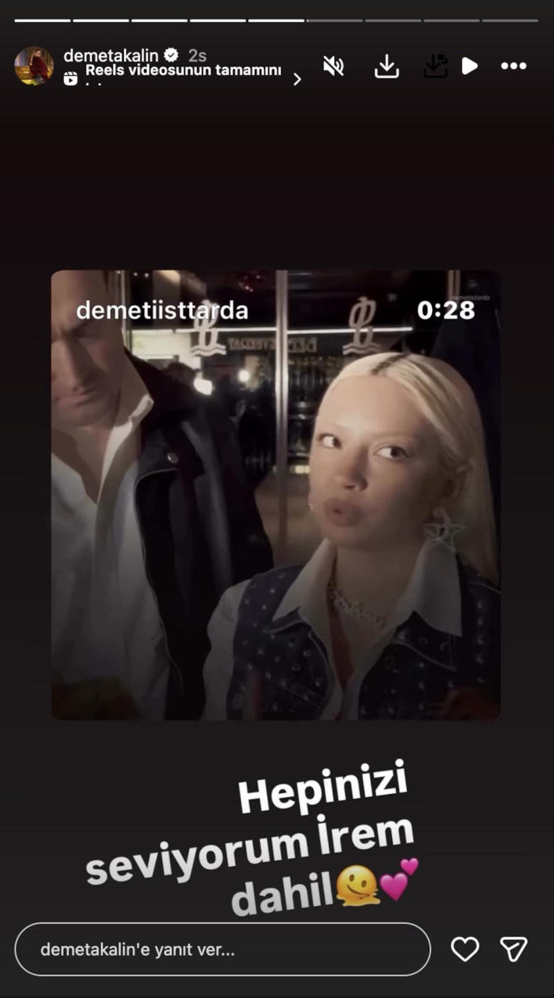 Kendisine yapılan bir video editi alıntılayan Demet Akalın'dan bu sözleri söyleyen Derici'ye barışma hamlesi geldi. Akalın yaptığı paylaşımda, "Hepinizi seviyorum İrem dahil." yazdı.