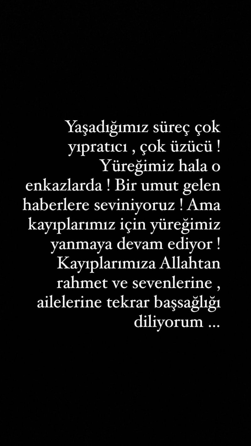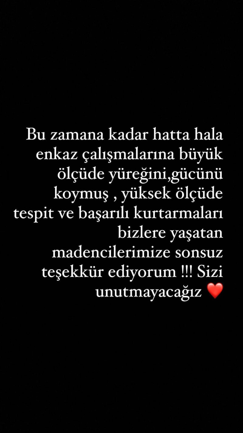 "Bu zamana kadar hatta hâlâ enkaz çalışmalarına büyük ölçüde yüreğini, gücünü koymuş, yüksek ölçüde tespit ve başarılı kurtarmaları bizlere yaşatan madencilerimize sonsuz teşekkür ediyorum. Sizi unutmayacağız."