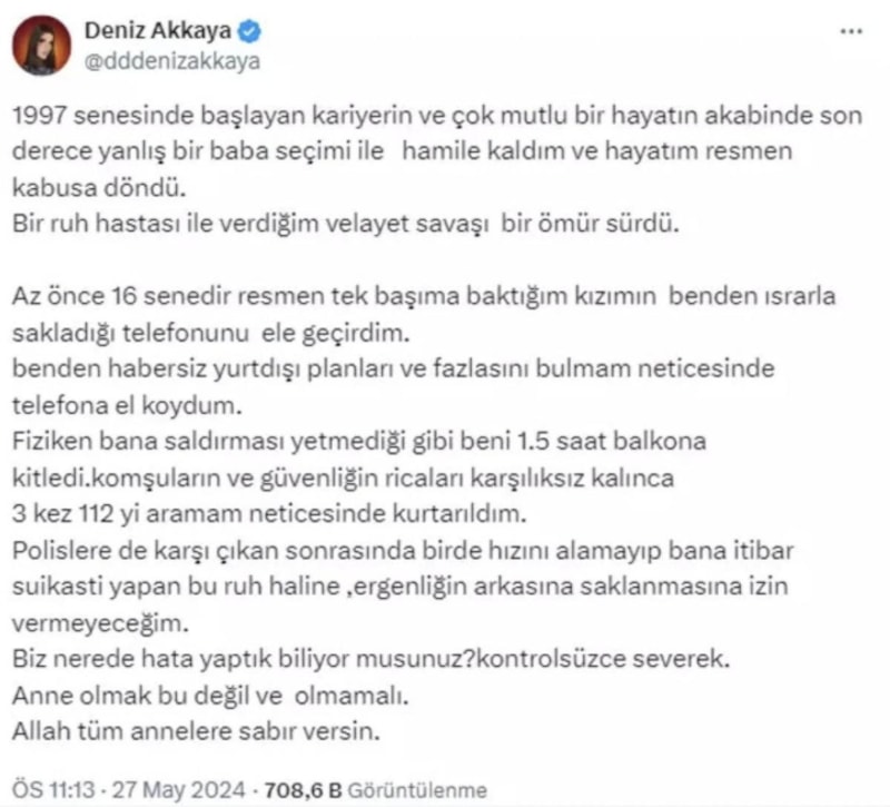 Deniz Akkaya, dün sosyal medya hesabı üzerinden kızının kendisini dövdüğüne yönelik açıklamalar yaptı.