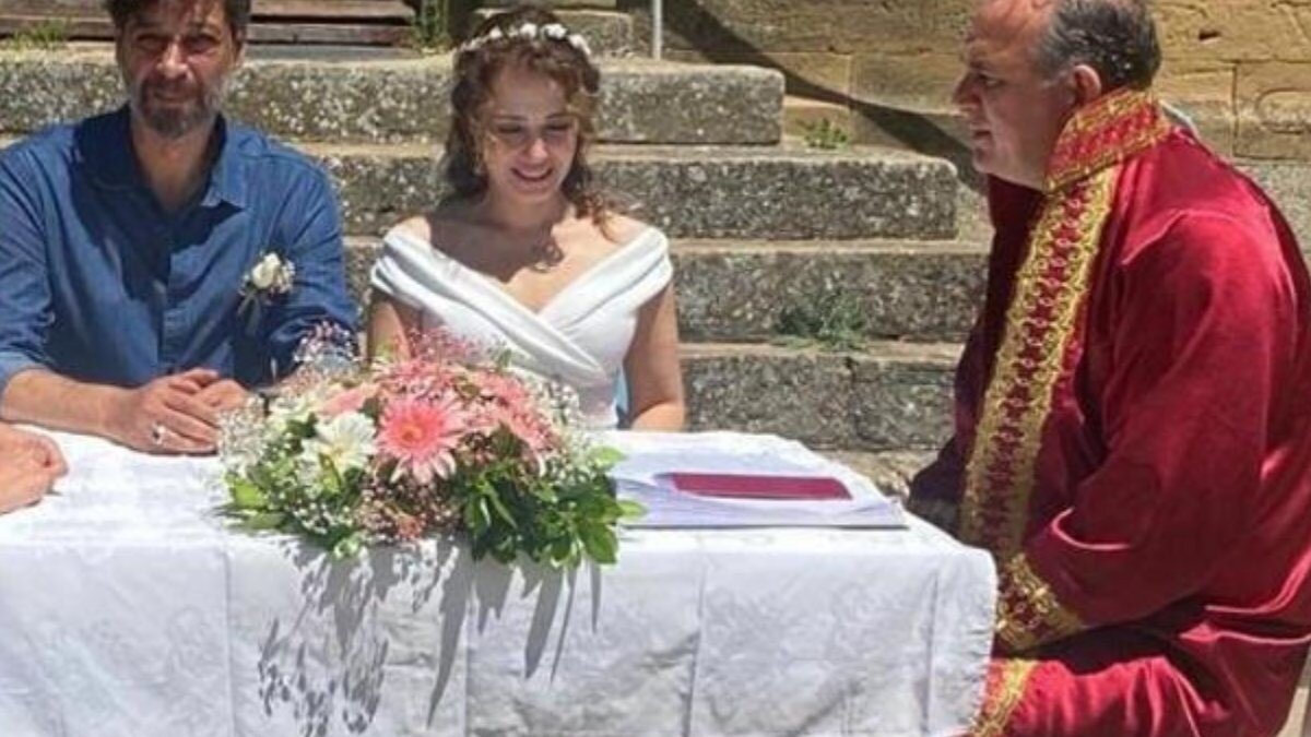 Gökçeada'da nikah masasına oturan çifti, yakın dostları yalnız bırakmadı.