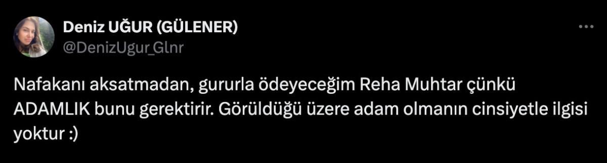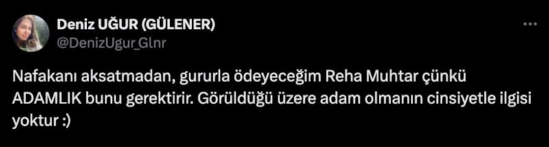 Uğur paylaşımında, "Nafakanı aksatmadan, gururla ödeyeceğim Reha Muhtar çünkü adamlık bunu gerektirir. Görüldüğü üzere adam olmanın cinsiyetle ilgisi yoktur." ifadelerine yer verdi.