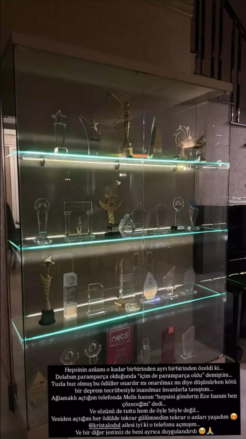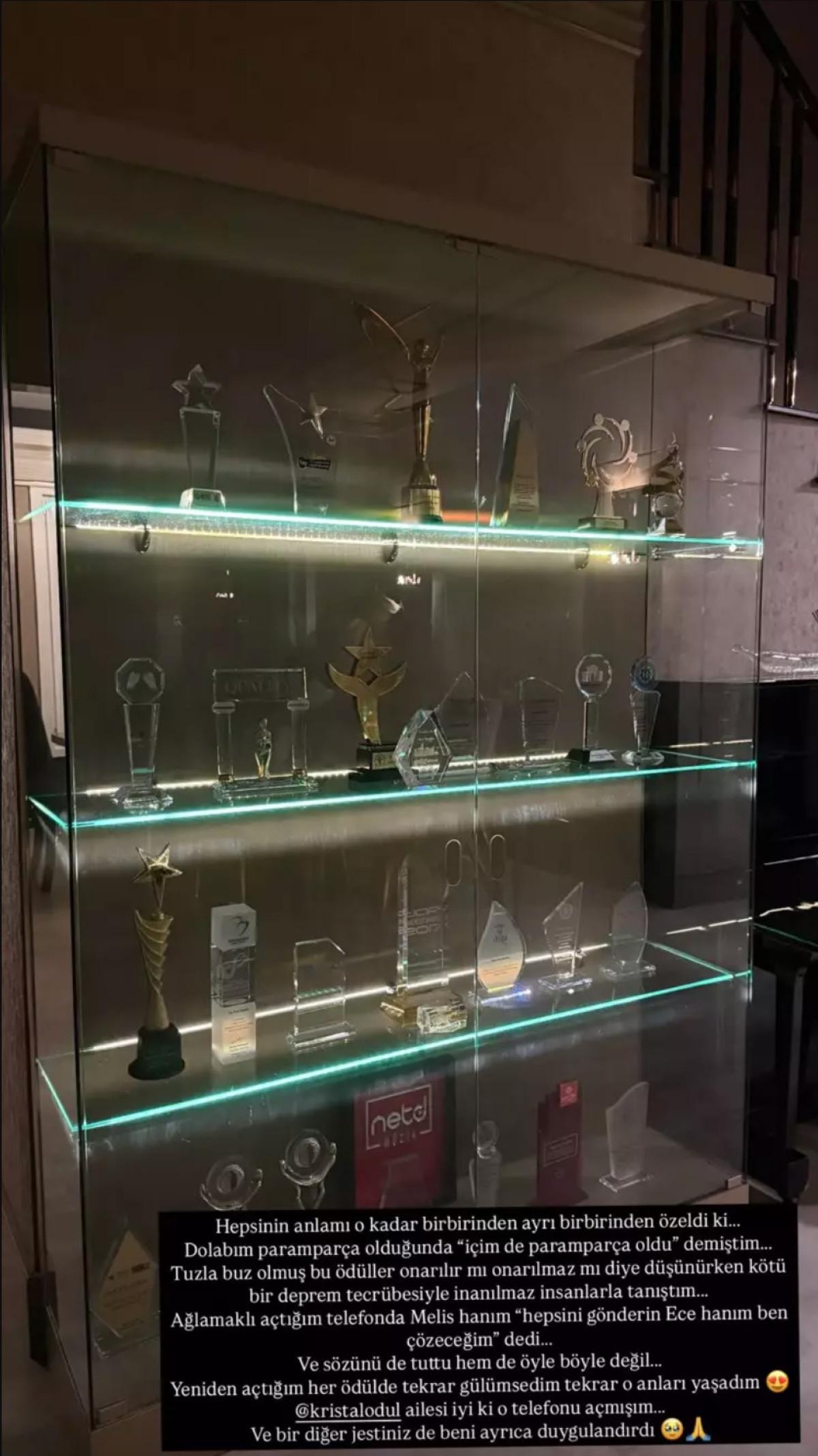Depreme evinde yakalanan ünlü şarkıcı Ece Seçkin'in ödülleri, sarsıntı yüzünden yere düşmüş ve tuzla buz olmuştu.