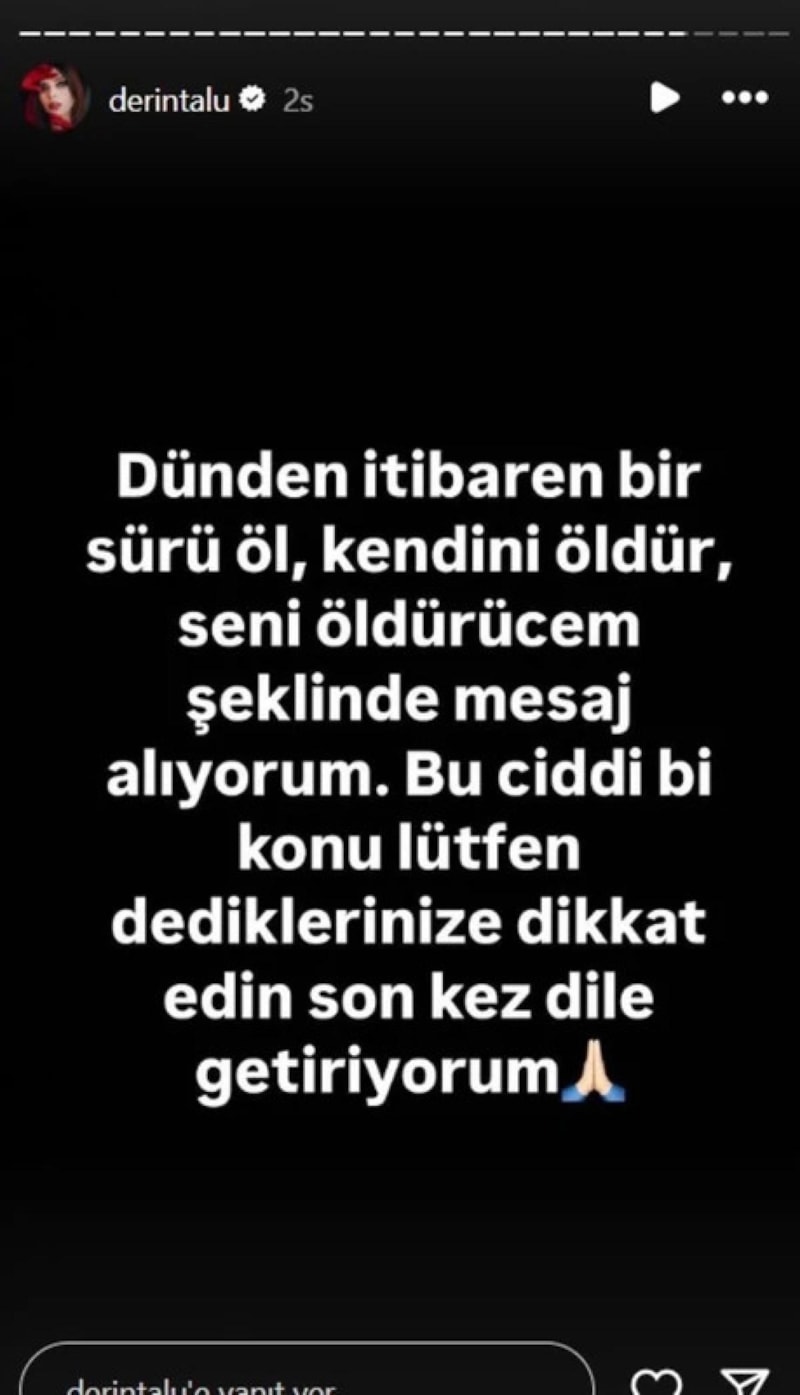 Talu, Instagram hesabından yaptığı videolu paylaşımda, “Dünden itibaren bir sürü ‘öl’, ‘kendini öldür’, ‘seni öldüreceğim’ gibi mesaj alıyorum. Bu ciddi bir konu. Lütfen söylediklerinize dikkat edin. Son kez dile getiriyorum” dedi.