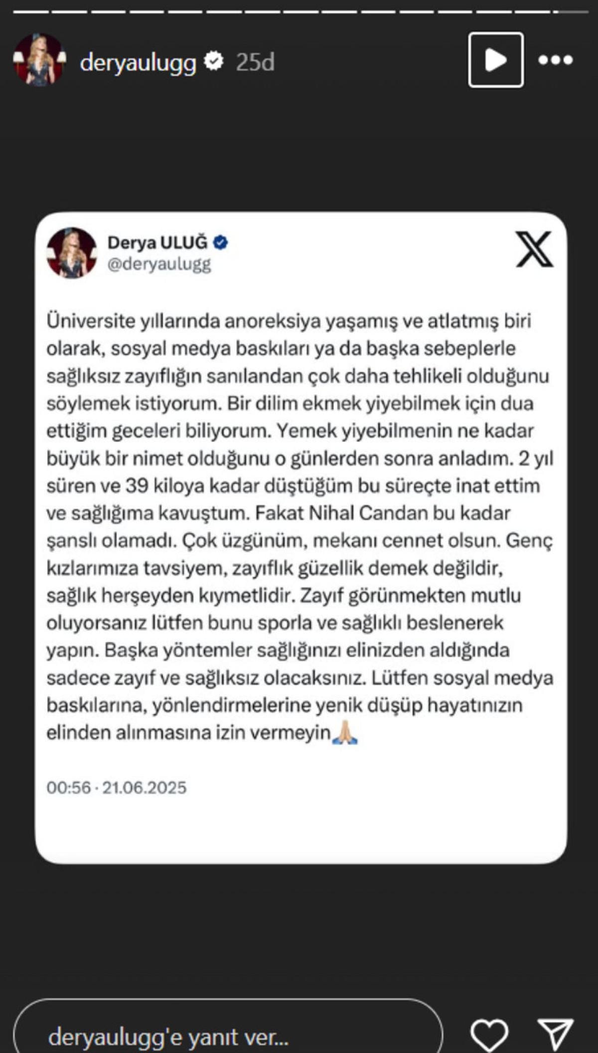 Derya Uluğ, özellikle genç kızlara yönelik önemli bir tavsiyede bulunarak, sağlığın her şeyden daha kıymetli olduğunu vurguladı;