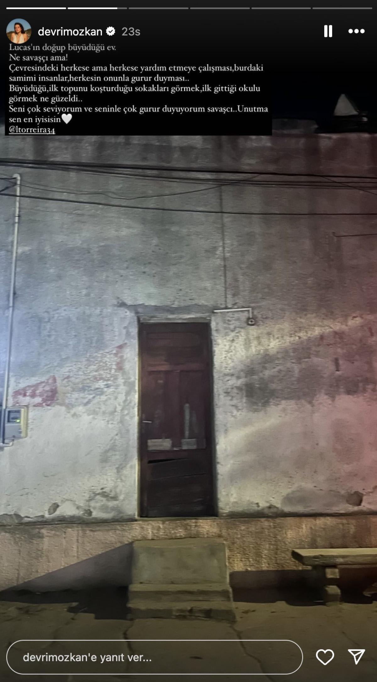 Ünlü oyuncu, sevgilisinin doğduğu evi paylaşarak, Torreira'ya övgü dolu sözler söyledi. Özkan; "Lucas'ın doğup büyüdüğü ev. Ne savaşçı ama! Çevresindeki herkese ama herkese yardım etmeye çalışması, buradaki samimi insanlar, herkesin onunla gurur duyması...