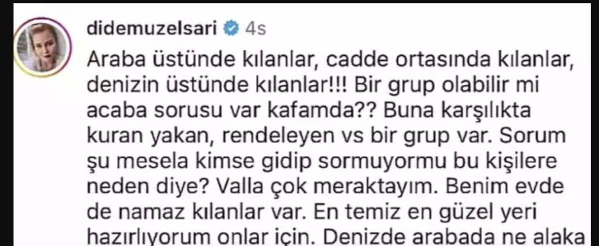 Denizde namaz kılındığını görünce bu durumu neden kimsenin sorgulamadığını sordu. Bir süredir ekranlardan uzak olan Didem Uzel şunları yazdı:
