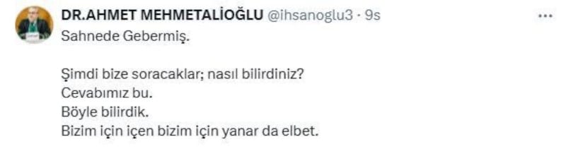 Çatalca Müftüsü Ahmet Mehmetalioğlu, sahnede hayatını kaybeden Volkan Konak'ın Diyanet İşleri Başkanı Ali Erbaş’a içkili göndermesini hatırlattı: Bizim için yanarsın elbet..