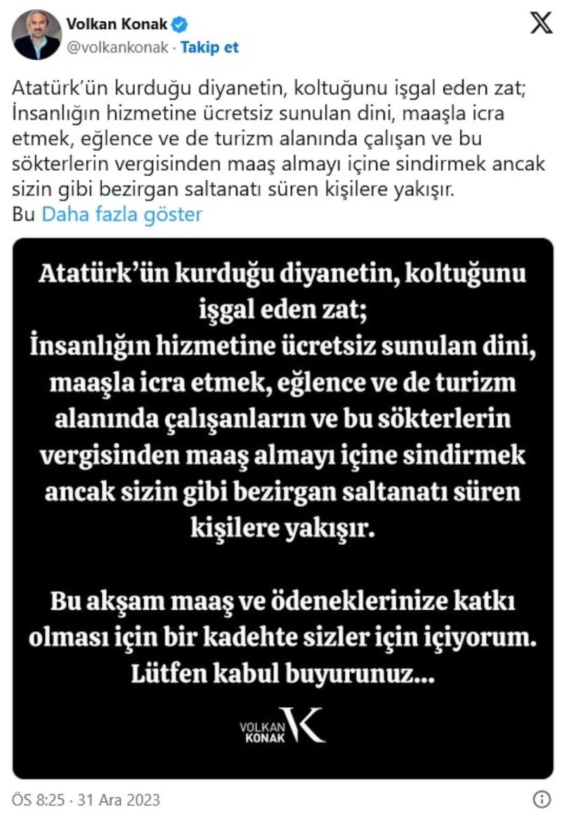 Diyanet personelinin, eğlence mekanlarından alınan vergilerle maaş almasını eleştiren Konak, bu duruma ironik bir göndermede bulunarak, içtiği bir kadeh içkiyle maaşlarına katkıda bulunduğunu belirtmişti.