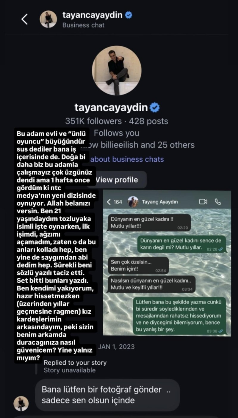 Sosyal medya hesabından bir ifşada bulunan genç oyuncu, 2022 yılında rol aldığı Tozluyaka dizisinde henüz 21 yaşındayken, evli olan rol arkadaşı Tayanç Ayaydın tarafından sözlü ve yazılı tacize maruz kaldığını belirtti.