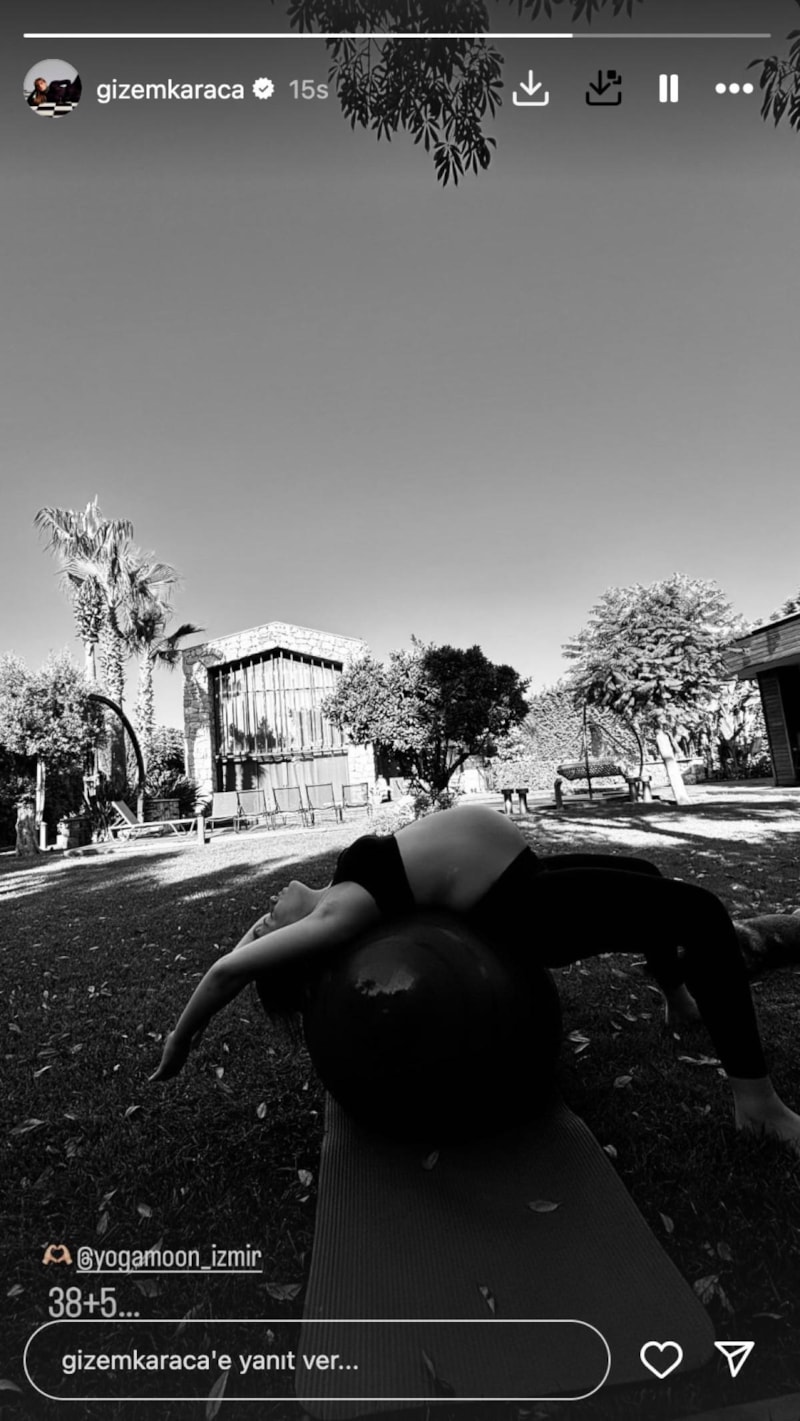 Hamileliğinin 38. haftasında olan Karaca, doğuma hazırlık olarak yoga yapıyor. Karnı burnunda olan oyuncu, pilates topu üzerinde yaptığı yoga pozunu sosyal medya hesabından takipçileriyle paylaştı