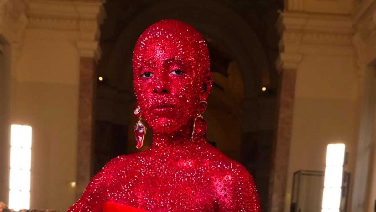 Cat'in vücudu, etkinlik öncesinde tamamen kırmızıya boyandı. Sonrasında ise 30 bin kristal, şarkıcının üzerine yerleştirildi.