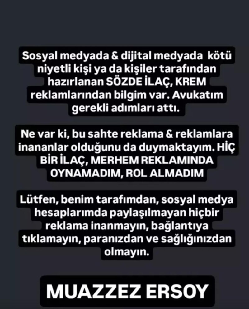 "Sosyal medya ve dijital medyada kötü niyetli kişi veya kişiler tarafından hazırlanan sözde ilaç, krem reklamlarından bilgim var. Avukatım gerekli adımları attı.