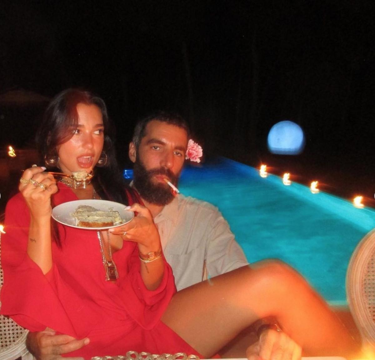 Kasığına kadar yırtmacıyla poz verirken frikik de veren Dua Lipa daha sonra ise sevgilisinin kucağına oturup yemek yediği o anları paylaştı.