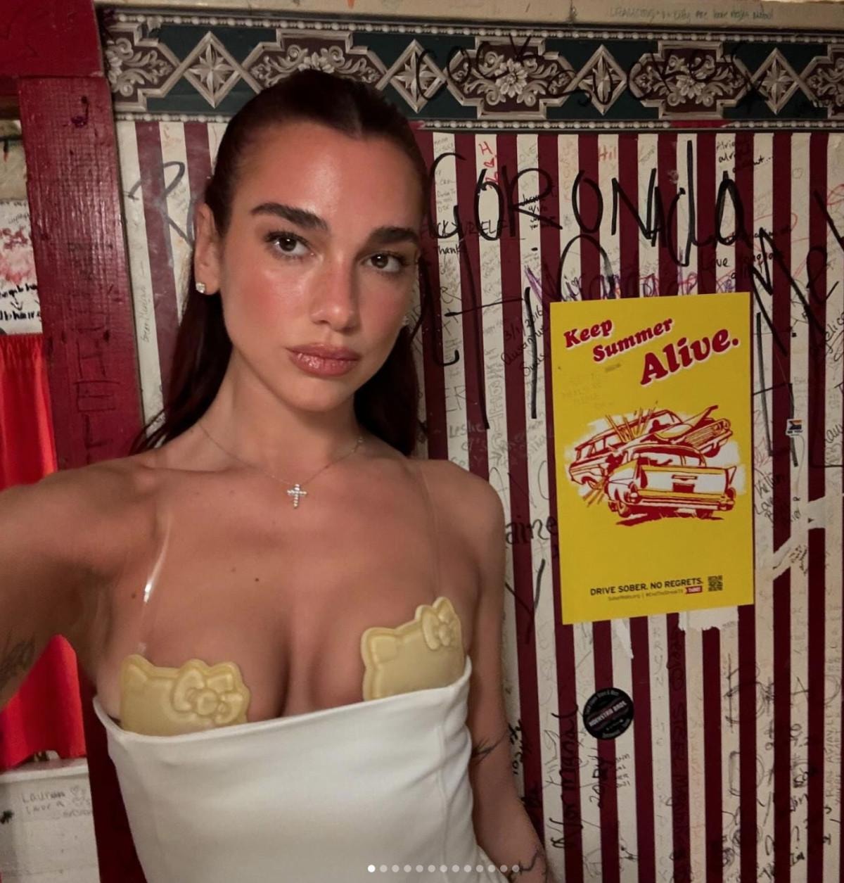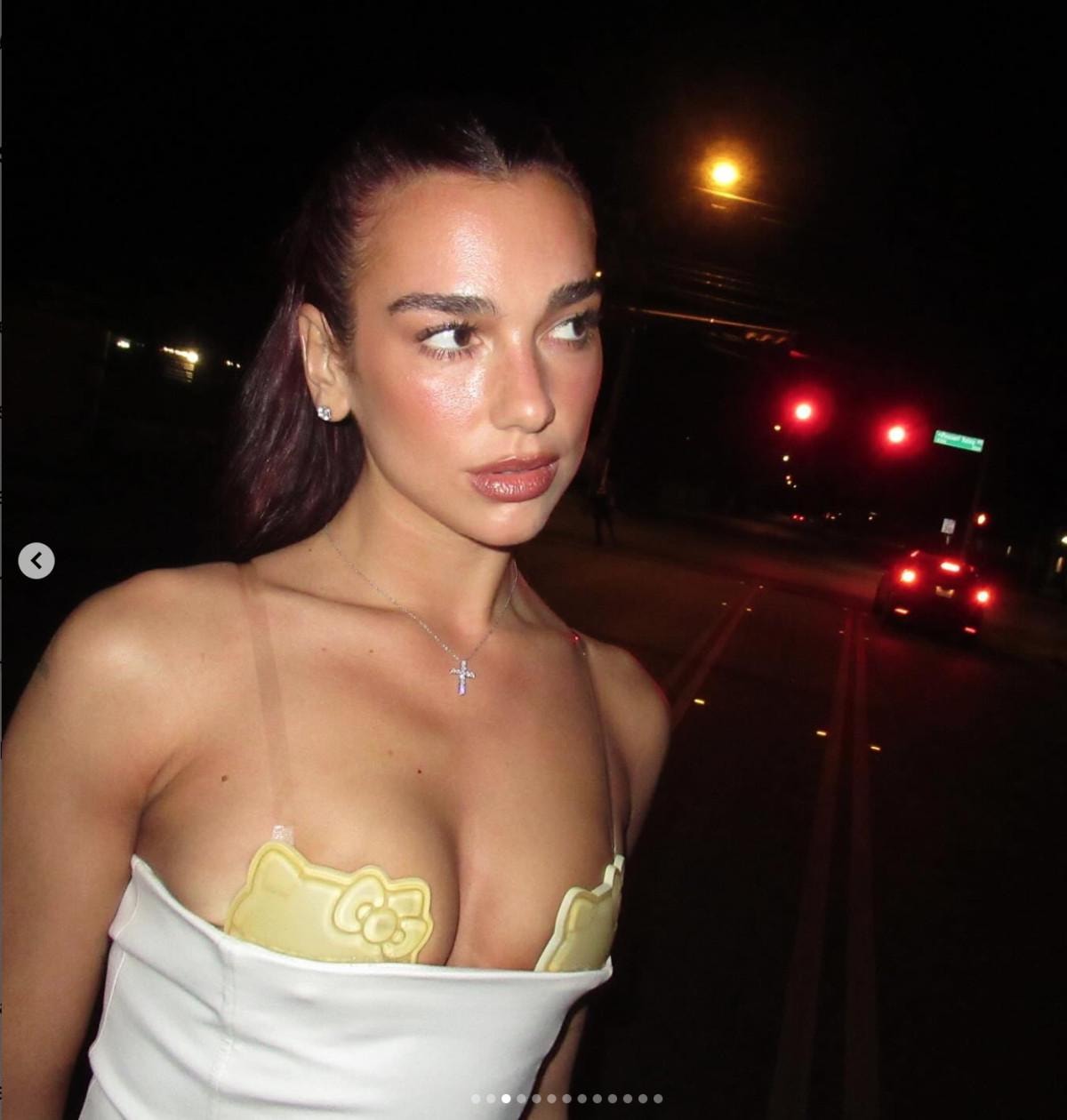Bri davete katılan Lipa, beyaz elbisesiyle boy gösterdi. Lipa'nın tarzından ilginç bir Hello Kitty sarı sütyeni göze çarptı.
