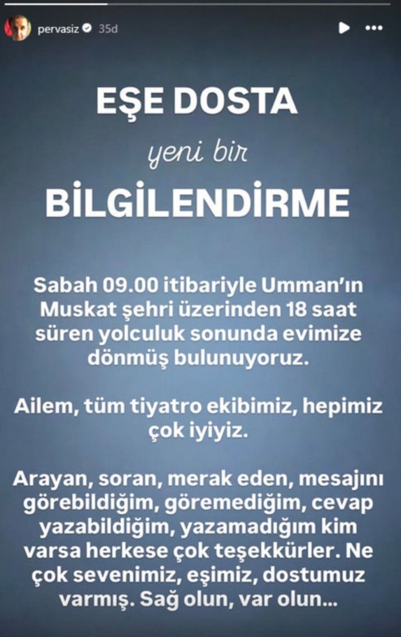 Ayrık, yaptığı yeni açıklamada Türkiye'ye döndüklerini duyurdu. Ayrık, "Sabah 09.00 itibarıyla Umman'ın Maskat şehri üzerinden 18 saat süren yolculuk sonunda evimize dönmüş bulunuyoruz. Ailem, tüm tiyatro ekibimiz, hepimiz çok iyiyiz. Arayan, soran, merak eden, mesajını görebildiğim, göremediğim, cevap yazabildiğim, yazamadığım kim varsa herkese çok teşekkürler. Ne çok sevenimiz, eşimiz, dostumuz varmış. Sağ olun, var olun." dedi.