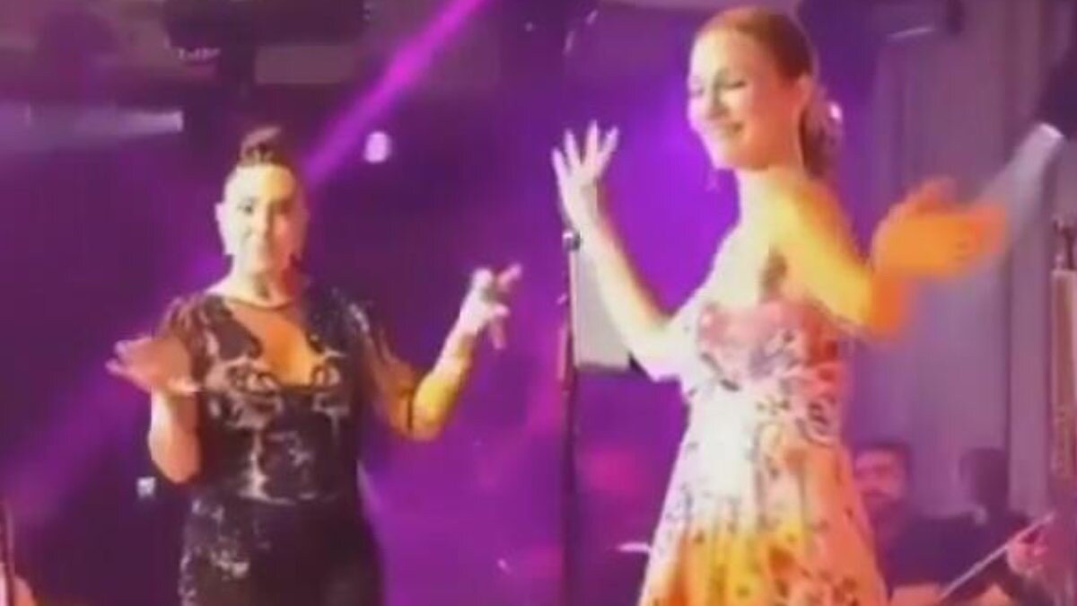 Hem dans edip hem de şarkı söyleyen Gündeş, ünlü oyuncu Meryem Uzerli'yi de sahneye davet etti. Antep çiftetellisiyle dans edip göbek atan ikilinin o anları kameralara yansıdı.