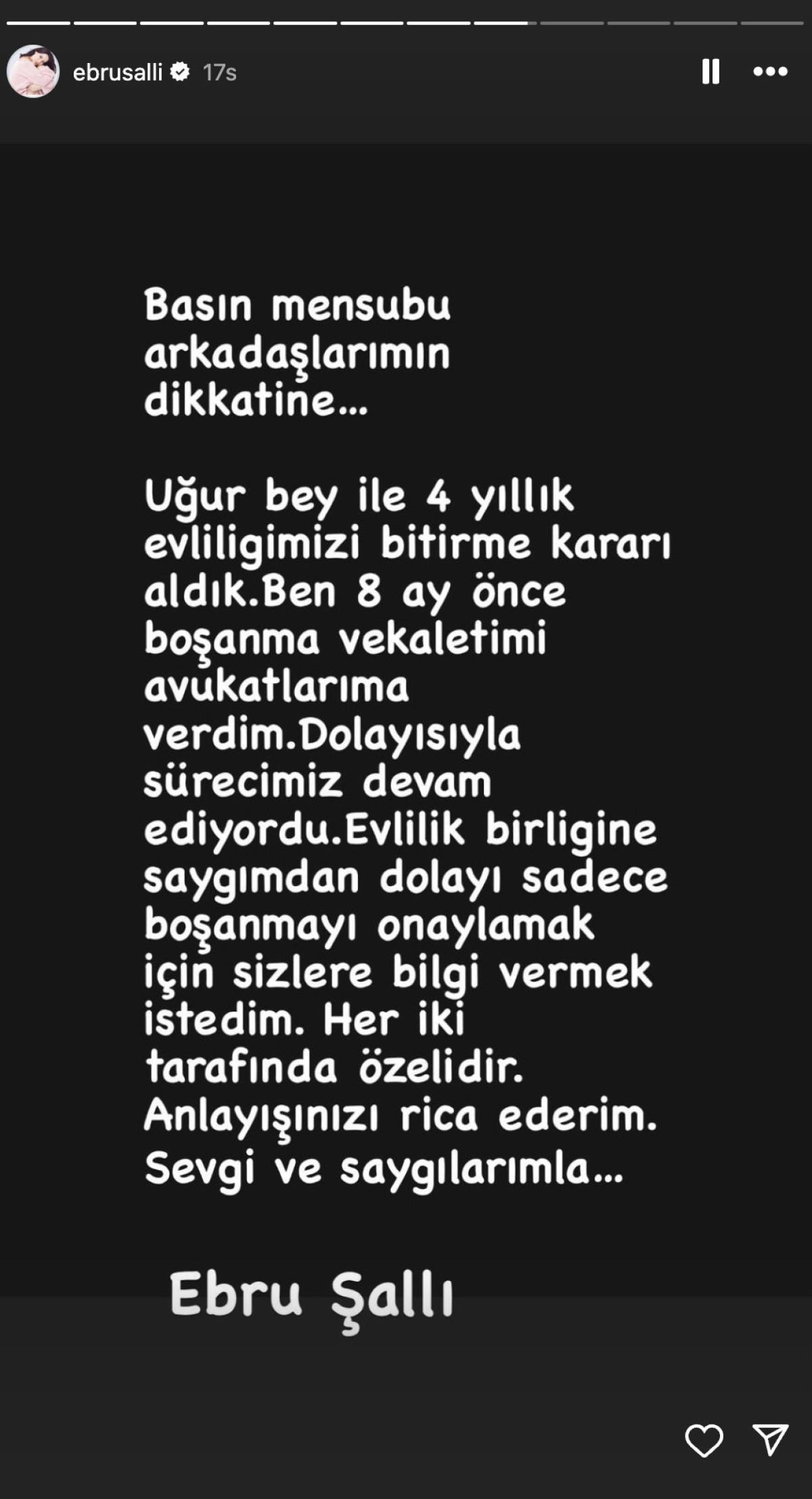 Şallı "Uğur Bey ile 4 yıllık evliliğimizi bitirme kararı aldık. Ben 8 ay önce boşanma vekaletimi avukatlarıma verdim. Dolayısıyla sürecimiz devam ediyordu.