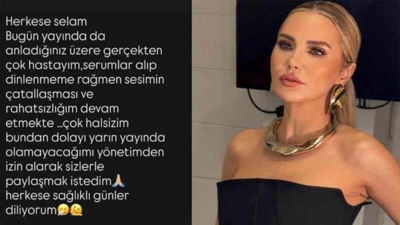 "Herkese selam, bugün yayında da anladığınız üzere gerçekten çok hastayım. Serumlar alıp dinlenmeme rağmen sesimin çatallaşması ve rahatsızlığım devam etmekte. Bundan dolayı yayında olamayacağımı yönetimden izin alarak sizlerle paylaşmak istedim. Herkese sağlıklı günler diliyorum."